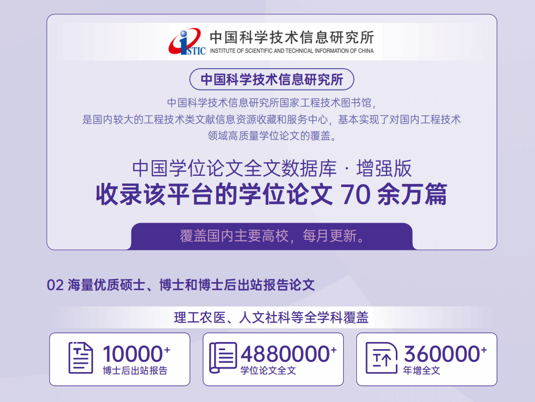 万方数据知识服务平台通过强化与科研院所、高校和出版机构的战略合作,不断提升对多源异构资源的整合、组织与发现能力,通过全文下载、原文传递服务形式全面升级原“中国学位论文全文数据库”,打造“中国学位论文全文数据库·增强版”,帮助用户快速便捷的获取高价值学术资源。