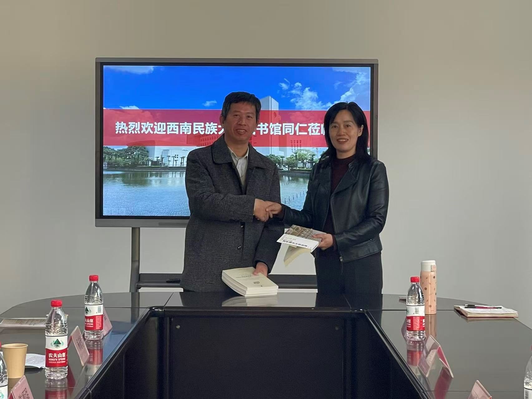 接下来,双方就特色品牌培育、文献资源建设优化、学科与信息咨询服务升级、智慧图书馆建设实践、管理与运行优化等五大方面,进行了互动交流与深入探讨,共商高校图书馆高质量发展路径。陈顺强副馆长、杨超超部长及其他调研成员结合自身工作实际,与我馆展开细致沟通。随后,王远弟代表我馆向西南民族大学图书馆赠送上海大学出版社《研究型大学图书馆建设与探索》以及“研究生学术论文写作”丛书等。