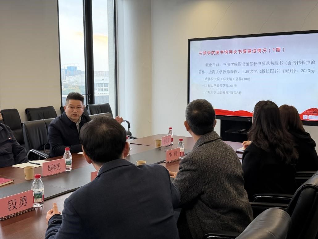 紧接着,三明学院图书馆副馆长张长华介绍此行核心目标,重点围绕数据库资源共享、伟长书屋建设、阅读推广人才共育三项任务,借鉴上海大学的成熟经验,为三明学院教学科研与文化服务注入动能。教务处处长赖祥亮、社会合作处处长夏智勇分别结合教学需求与落地保障补充发言。